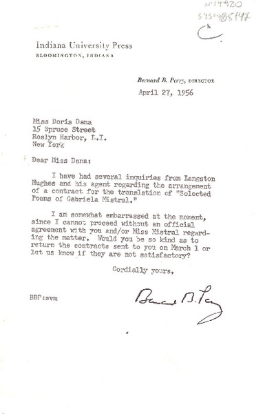 [Carta] 1961 may 3, [New York, Estados Unidos] [a] Bernard B. Perry, con copia a Doris Dana, Bloomingston, Indiana, [Estados Unidos] [manuscrito] [Joan Daves].