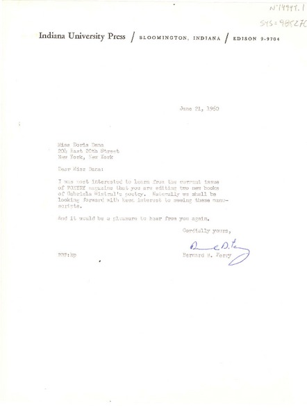 [Carta] 1960 jun. 21, [Bloomington, Indiana, Estados Unidos] [a] Doris Dana, New York, [Estados Unidos] [manuscrito] Bernard B. Perry.