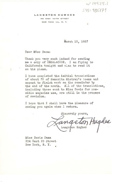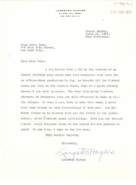 Hughes, Langston - Manuscritos estadounidenses - Dana, Doris - Correspondencia