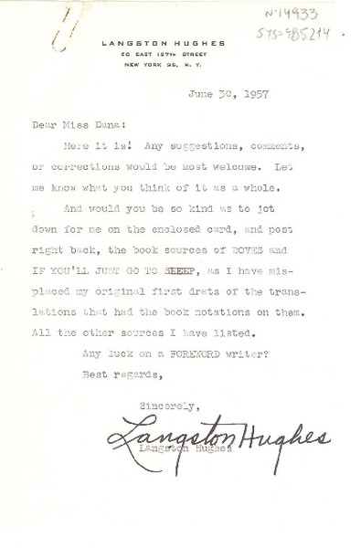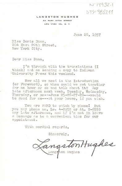 [Carta] 1957 jun. 30, [New York, Estados Unidos] [a] [Doris] Dana, [New York, Estados Unidos] [manuscrito] Langston Hughes.