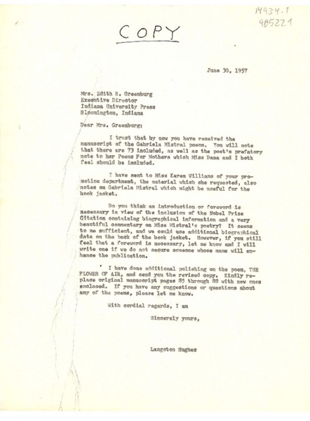 [Carta] 1957 jun. 30, [Estados Unidos] [a] Edith R. Greenburg, Bloomington, Indiana, [Estados Unidos] [manuscrito] Langston Hughes.