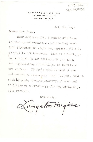 [Carta] 1957 jul. 19, [New York, Estados Unidos] [a] [Doris] Dana, New York, [Estados Unidos] [manuscrito] Langston Hughes.