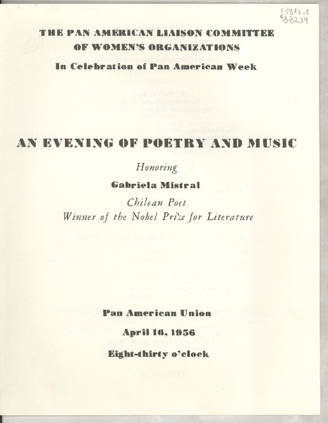 An evening of poetry and music : Honoring Gabriela Mistral [programa] Pan American Liaison Committee of Women's Organizations, Pan American Union.