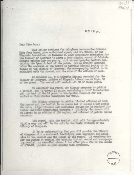 [Carta] 1970 Dec. 3, [Estados Unidos] [a] Mr. William W. Rossiter, Washington D. C. [manuscrito] Joan Daves.