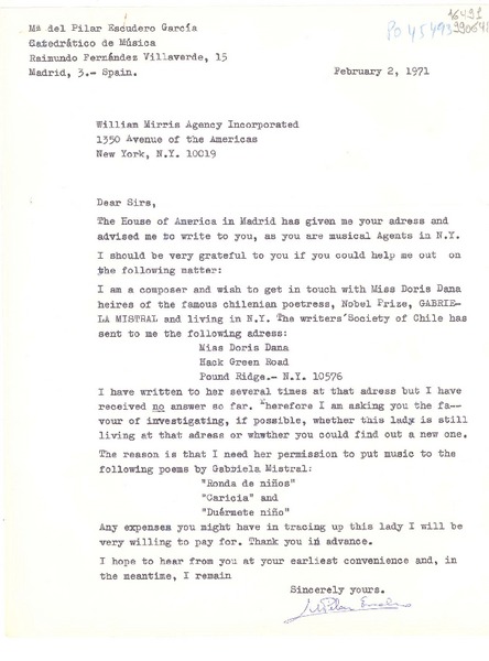 [Carta] 1971 Feb. 2, Madrid, Spain [a] William Mirris Agency Incorporated, 1350 Avenue of the Americas, New York, N. Y. [manuscrito] M. Pilar Escudero.