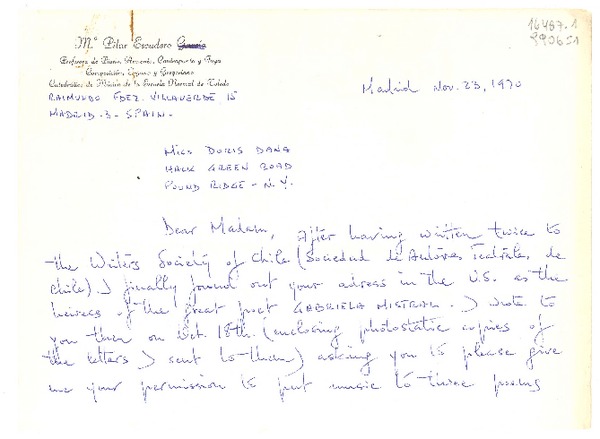 [Carta] 1970 Nov. 23, Raimundo Fdez. Villaverde, 15, Madrid 3, Spain [a] Miss Doris Dana, Hack Green Road, Pound Ridge, N. Y., [EE.UU.] [manuscrito] Ma. Pilar Escudero.