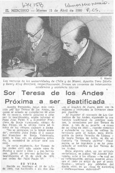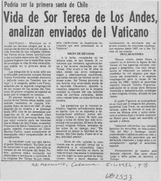 Sor Teresa de Los Andes puede ser santificada". [artículo]