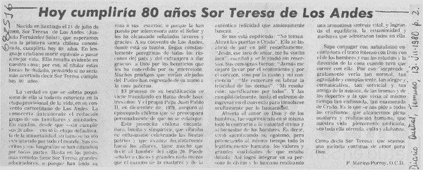 Hoy cumpliría 80 años Sor Teresa de Los Andes [artículo] Marino Purroy.