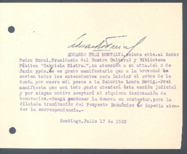 [Carta] 1950 jul. 17, Santiago, Chile [a] Pedro Moral [manuscrito] Eduardo Frei Montalva.