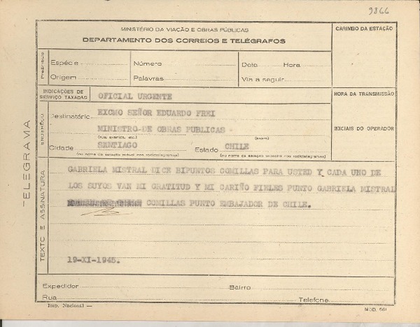[Telegrama] 1945 nov. 19, [Brasil] [a] Eduardo Frei, Santiago, Chile [manuscrito] Gabriela Mistral.
