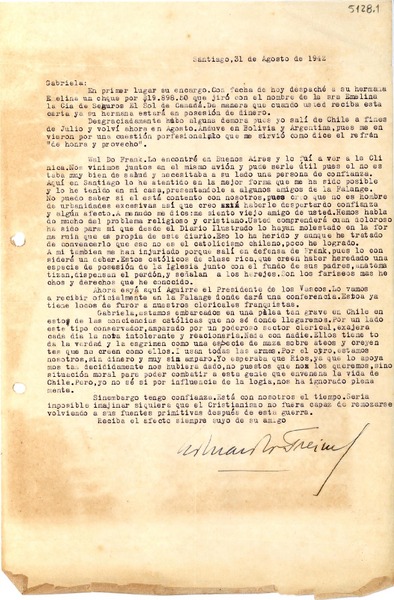 [Carta] 1942 ago. 31, Santiago, [Chile] [a] Gabriela Mistral [manuscrito] Eduardo Frei [Montalva].