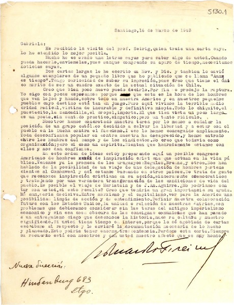 [Carta] 1943 mar. 16, Santiago, [Chile] [a] Gabriela Mistral [manuscrito] Eduardo Frei [Montalva].