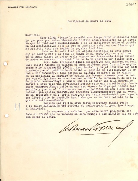 [Carta] 1943 ene. 2, Santiago, [Chile] [a] Gabriela Mistral [manuscrito] Eduardo Frei [Montalva].