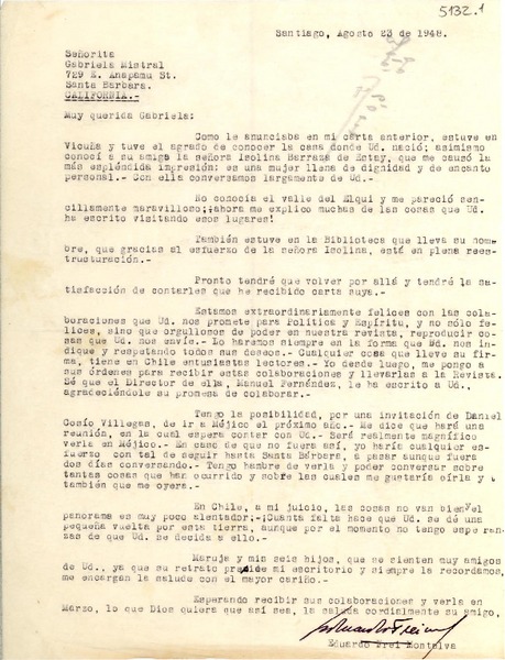 [Carta] 1948 ago. 23, Santiago, [Chile] [a] Gabriela Mistral, Santa Bárbara, California, [EE.UU.] [manuscrito] Eduardo Frei Montalva.