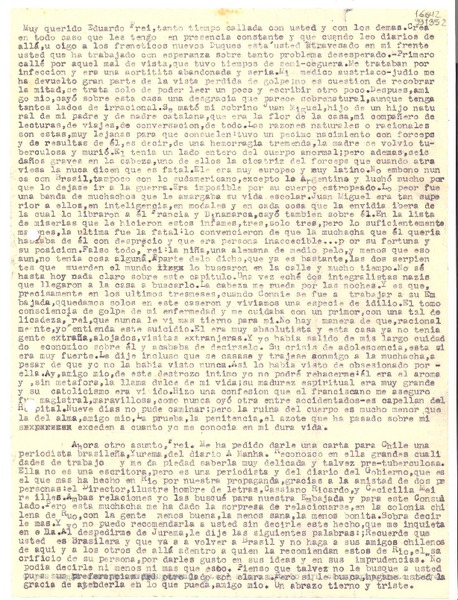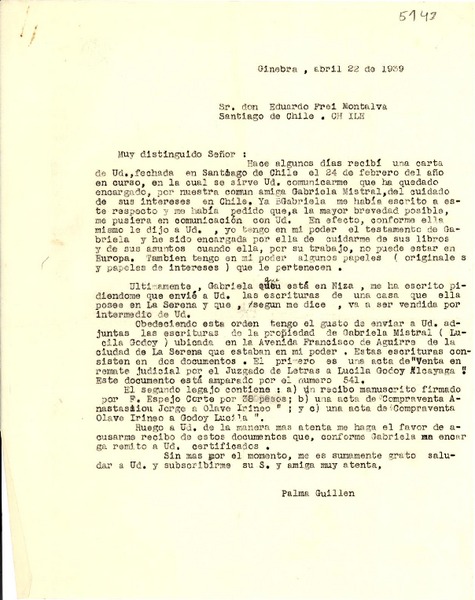 [Carta] 1939 abr. 22, Ginebra, [Suiza] [a] Eduardo Frei [Montalva], Santiago, Chile [manuscrito] Palma Guillén [de Nicolau].