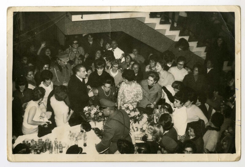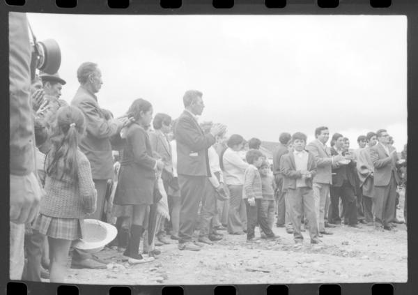 Campesinos de Osorno con sus mujeres e hijos reunidos en el acto de entrega de sus Títulos de Dominio de sus tierras. La actividad contó con la presencia de diversas autoridades de la época, entre ellos, Jaime Súarez en su calidad de Senador e integrante de la Comisión de Agricultura de la Cámara Alta. En la mesa donde está la autorida hay un carabinero. También contó con la participación de un Orfeón de uniformados haciendo su aporte musical.