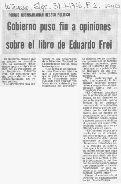 Prohibidas réplicas y apoyos a libro de Frei [artículo] Gastón Zúñiga Paredes.