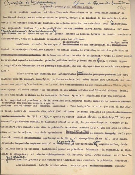 Don Manuel Seoane y la reforma agraria [manuscrito] Fernando Santiván.