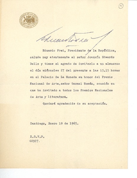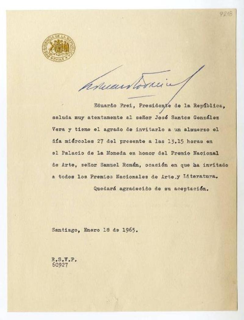 El Presidente de la República saluda a J.E.B. y lo invita a un almuerzo, en el Palacio de La Moneda, en honor al Premio Nacional de Arte, señor Samuel Román.