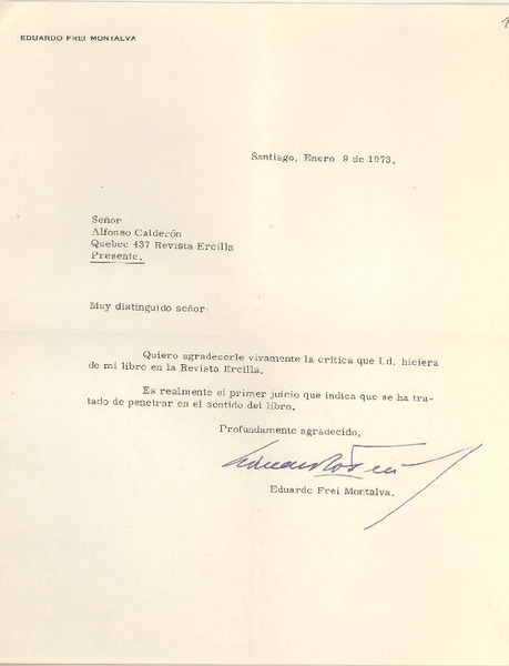 Santiago, Chile [a] Alfonso Calderón Carta, 9 de enero de 1973, [manuscrito] Eduardo Frei Montalva