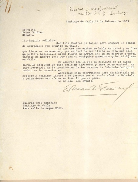 [Carta] 1939 feb. 24, Santiago, Chile [a] Palma Guillén, Ginebra, [Suiza] [manuscrito] Eduardo Frei Montalva.