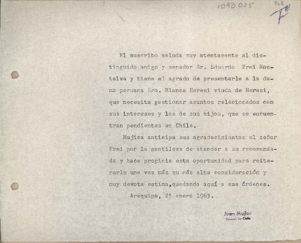 [Carta] 1963 enero 25, Arequipa, Perú [a] Eduardo Frei Montalva, Santiago, Chile [manuscrito] Juan Mujica de la Fuente.