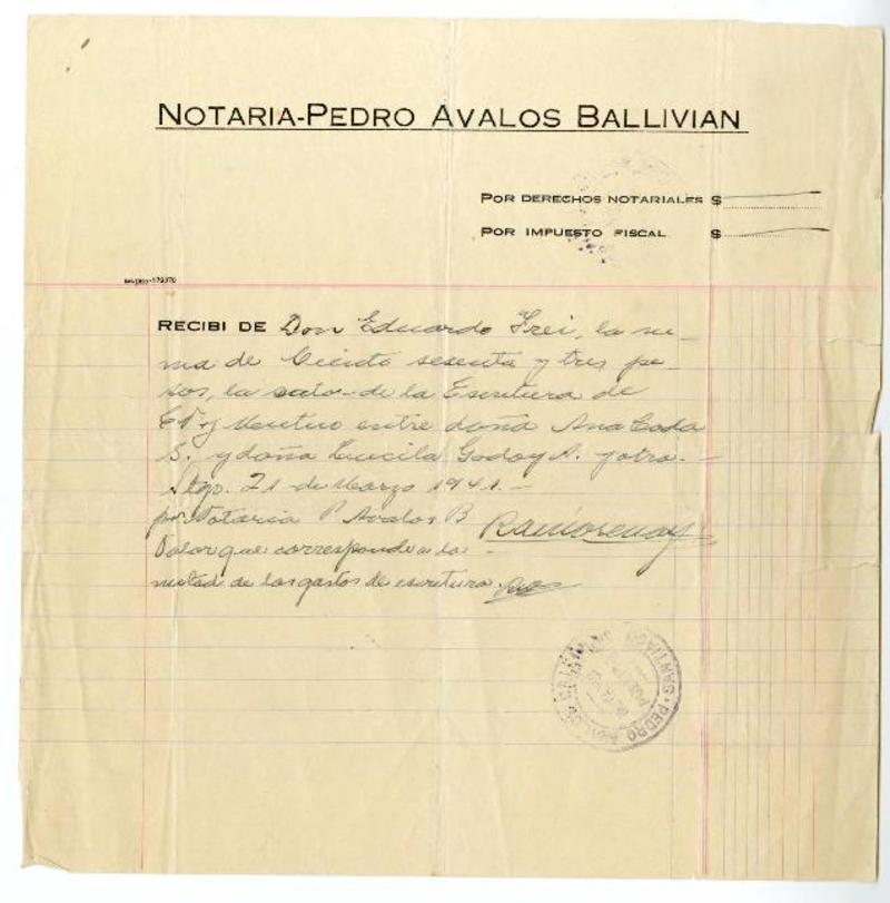 Recibos y comprobante notarial por el pago de los servicios prestados por Eduardo Frei Montalva a Lucila Godoy Alcayaga, con motivo de los trámites de la venta de una propiedad.