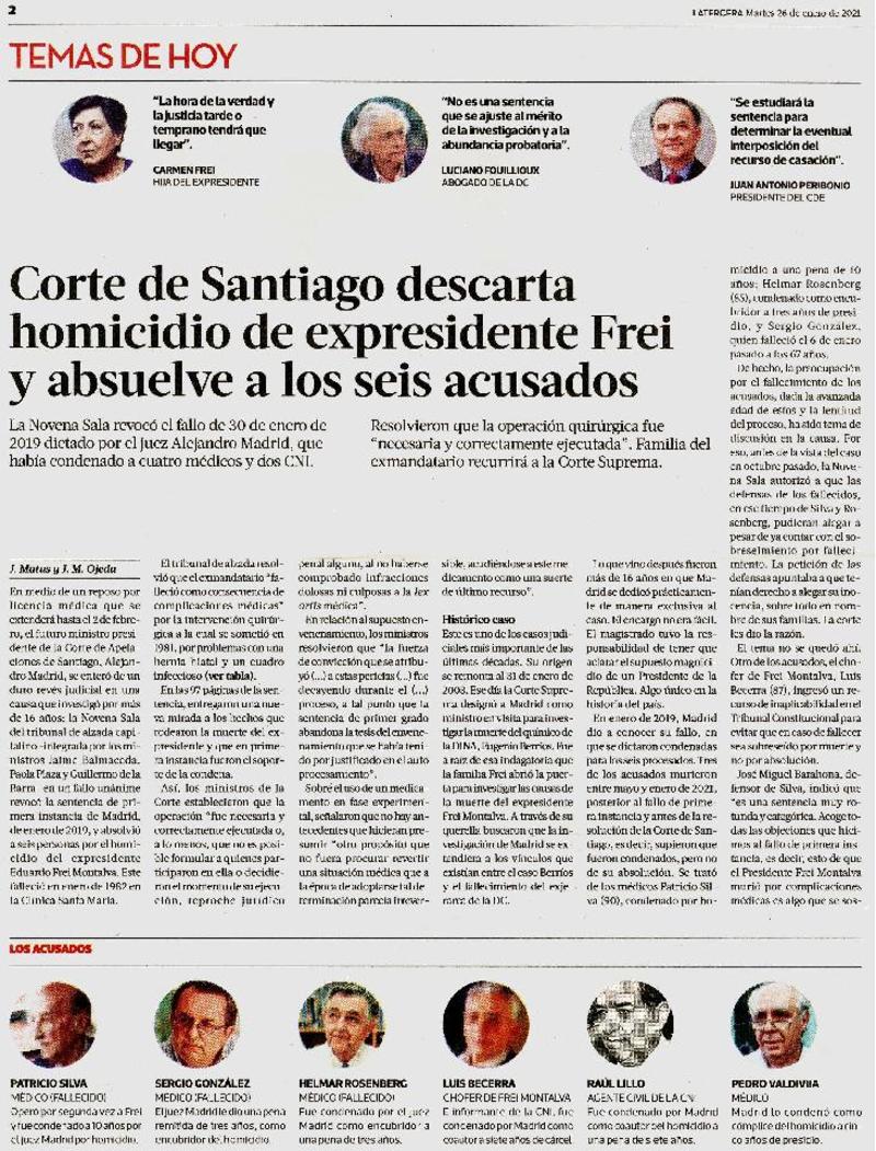 Corte de Santiago descarta homicidio de expresidente Frei y absuelve a los seis acusados [artículo] J. Matus y Ojeda J.M.