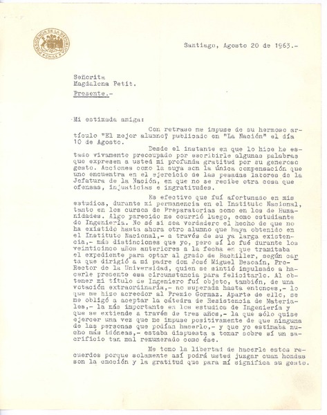 [Carta] 1963 ago. 20, Santiago, Chile [a] Magdalena Petit [manuscrito] Jorge Alessandri Rodríguez.