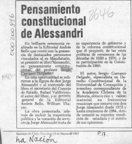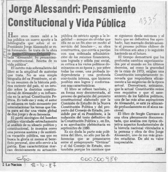 Jorge Alessandri, pensamiento constitucional y vida pública [artículo] J. M. L.