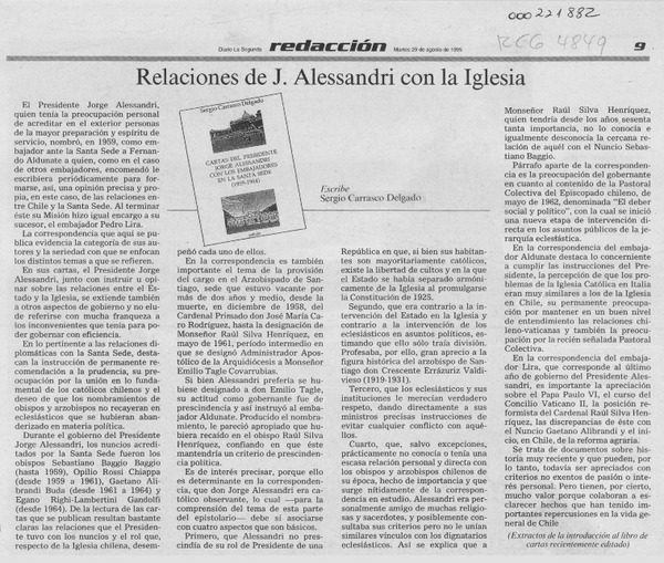 Relaciones de J. Alessandri con la Iglesia [artículo] Sergio Carrasco Delgado.