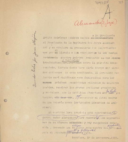 [Carta] 1959 noviembre 23, Santiago, Chile [a] Jorge Alessandri Roodríguez [manuscrito] Emilio Rodríguez Mendoza ; transcrito por Juan Mujica.