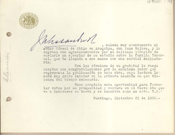 [Carta] 1960 diciembre 29, Santiago, Chile [a] Juan Mujica, Arequipa, Perú [manuscrito] Jorge Alessandri Rodríguez.