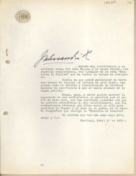 [Carta] 1960 abril 1, Santiago, Chile [a] Juan Mujica, Arequipa, Perú [manuscrito] Jorge Alessandri Rodríguez.
