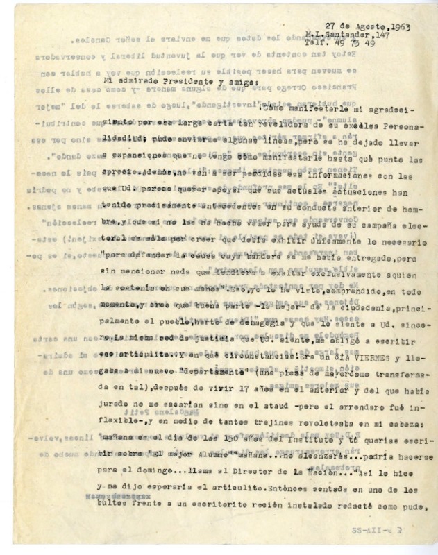 [Carta] 1963 agosto 27, Santiago, Chile [a] Jorge Alessandri Rodríguez [manuscrito] Magdalena Petit.