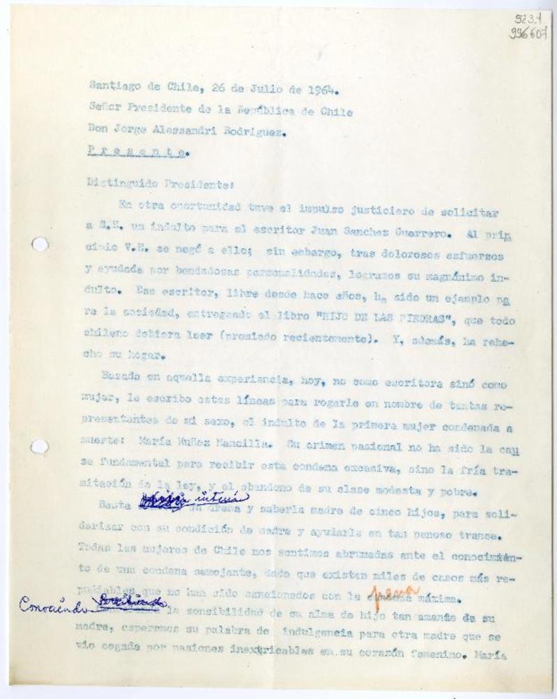 [Carta] 1964 julio 26, Santiago de Chile [a] Señor Presidente de la República de Chile Don Jorge Alessandri Rodriguez [manuscrito] Matilde Ladrón de Guevara.