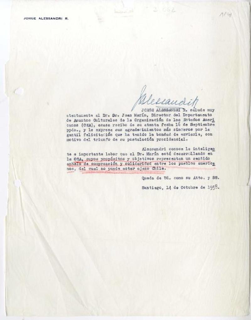 [Carta] 1958 octubre 14, Santiago, Chile [a] Juan Marín [manuscrito] Jorge Alessandri Rodríguez.
