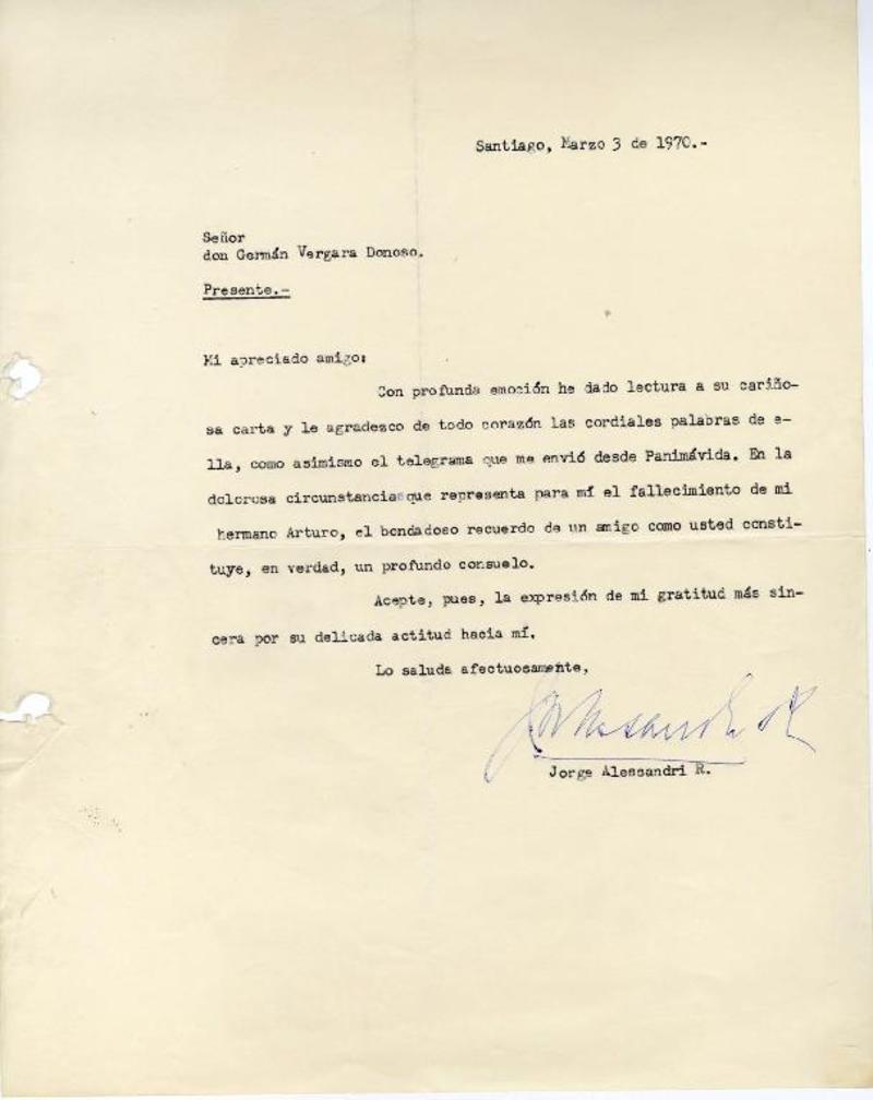 [Carta] 1970 marzo 3, Santiago, Chile [a] Germán Vergara [manuscrito] Jorge Alessandri Rodríguez.