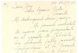 [Carta] 1926 abr. 8, Santiago, Chile [a] Pedro Aguirre Cerda, Chile [manuscrito] / Ida Corbat. 1 h. ; 11 x 14 cm. .
