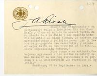 [Tarjeta] 1944 septiembre 27, Santiago, Chile [a] Juan Marín [manuscrito] Juan Antonio Ríos.