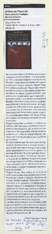 El Dios de Pinochet [artículo] / Víctor Hugo de la Fuente. Le Monde Diplomatique (Chile)-- no. 78 (sept. 2007) p. 38. .