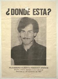 ¿Dónde está? Alejandro Alberto Pinochet Arenas: 23 años, soltero, egresado Liceo Industrial. Detenido el 7 de septiembre de 1987. [estampa] : [Chile] : [Editor no identificado], [198-?]. 1 cartel (afiche) : blanco y negro ; 38 x 28 cm. .