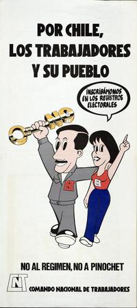 Por Chile, los trabajadores y su pueblo inscribámonos en los registros electorales. [estampa] : [Chile] : Comando Nacional de Trabajadores, [1988]. 1 cartel (afiche) : color ; 75 x 34 cm. .