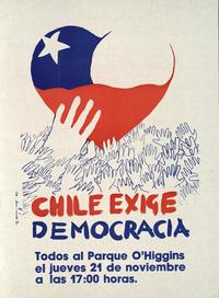 Chile exige democracia [estampa] : Nemesio Antúnez. Chile : Nemesio Antúnez, 1988. 1 cartel (afiche) : color ; 74 x 54 cm. .