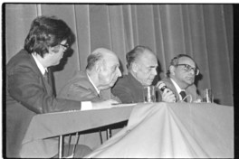 En la mesa está NN, Raúl Rettig Guissen, Presidente del Colegio de Abogados entre los años 1985 - 1987, Hugo Pereira Anabalón y Mario Verdugo Marinkovic.