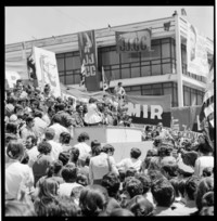 Fidel Castro Ruz con una niñita en brazos, habla en la Universidad de Concepción rodeado de estudiantes con banderas de la JJCC, del Mir y fotos de Fidel Castro. Detrás de Castro, entre los estudiantes, se encuentra don Edgardo Enríquez, Rector de la Universidad de Concepción.