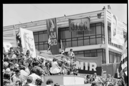 Fidel Castro Ruz se reune con sus adherentes en el Estadio Regional de la ciudad de Concepción. Se distingue un lienzo grande de el Consejo Provincial de Concepción de la Cut y banderas de los distintos partidos politicos qe integran la Unidad Popular.