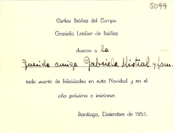 [Tarjeta] 1953 dic., Santiago, [Chile] [a] Gabriela Mistral [manuscrito] Carlos Ibáñez del Campo, Graciela Letelier de Ibáñez.