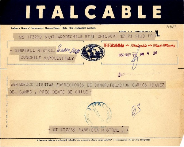[Telegrama] 1952 nov. 22, Santiago, Chile [a] Gabriela Mistral, Nápoles, [Italia] [manuscrito] Del Presidente de Chile Carlos Ibáñez del Campo.