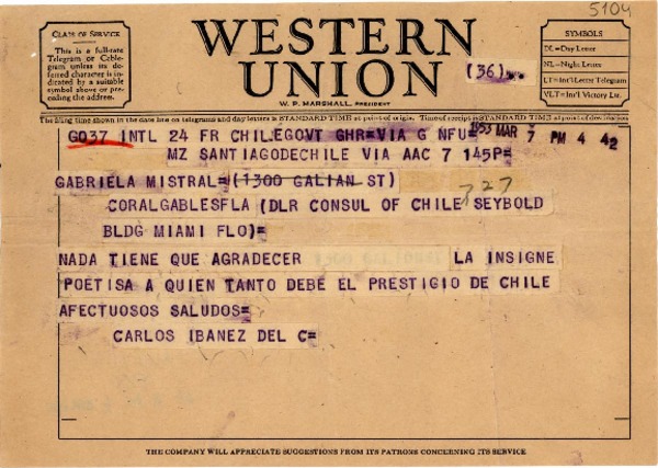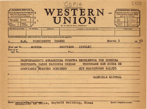 [Telegrama] 1953 mar. 7, Santiago, Chile [a] Gabriela Mistral, Miami, [EE.UU.] [manuscrito] Carlos Ibáñez del Campo.